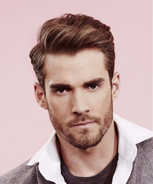 A brief and bleached beard is more definitive but not too much on a pear-shaped face. It goes well with a slicked-back hairstyle to stretch the forehead and make it sleek and sophisticated. The combination can be used in the office and in the formal world. The slicked-back hair is a source of attention drawing upward, and the fade makes the lower part of the face clean and well-structured. Pomade or gel keeps the hair where it should be, nd the beard keeps the fade where it should be. This mix portrays professional style, and confidence with a little effort.
