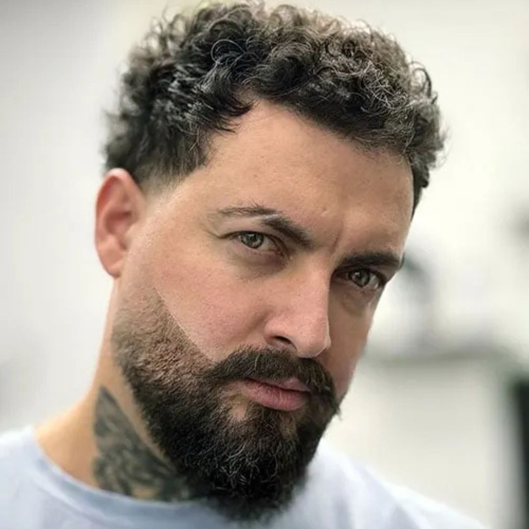 In males whose hair is curly in nature, a short beard and curly top hairstyle brings about a balance to the pear-shaped faces. The upper face is enriched with the volume of curls, which are also used to support a slimmer forehead, and the short beard shapes the jawline appropriately. This combination has a trendy, young look. Light curl mousse or creams do not add weight to hair. Frequent trimming of the beard maintains proportions, and the jawline does not seem excessively thick. This appearance is best in informal and social events, with a touch of the natural texture and symmetry, which is carelessly combined with the balance of the facial expression.