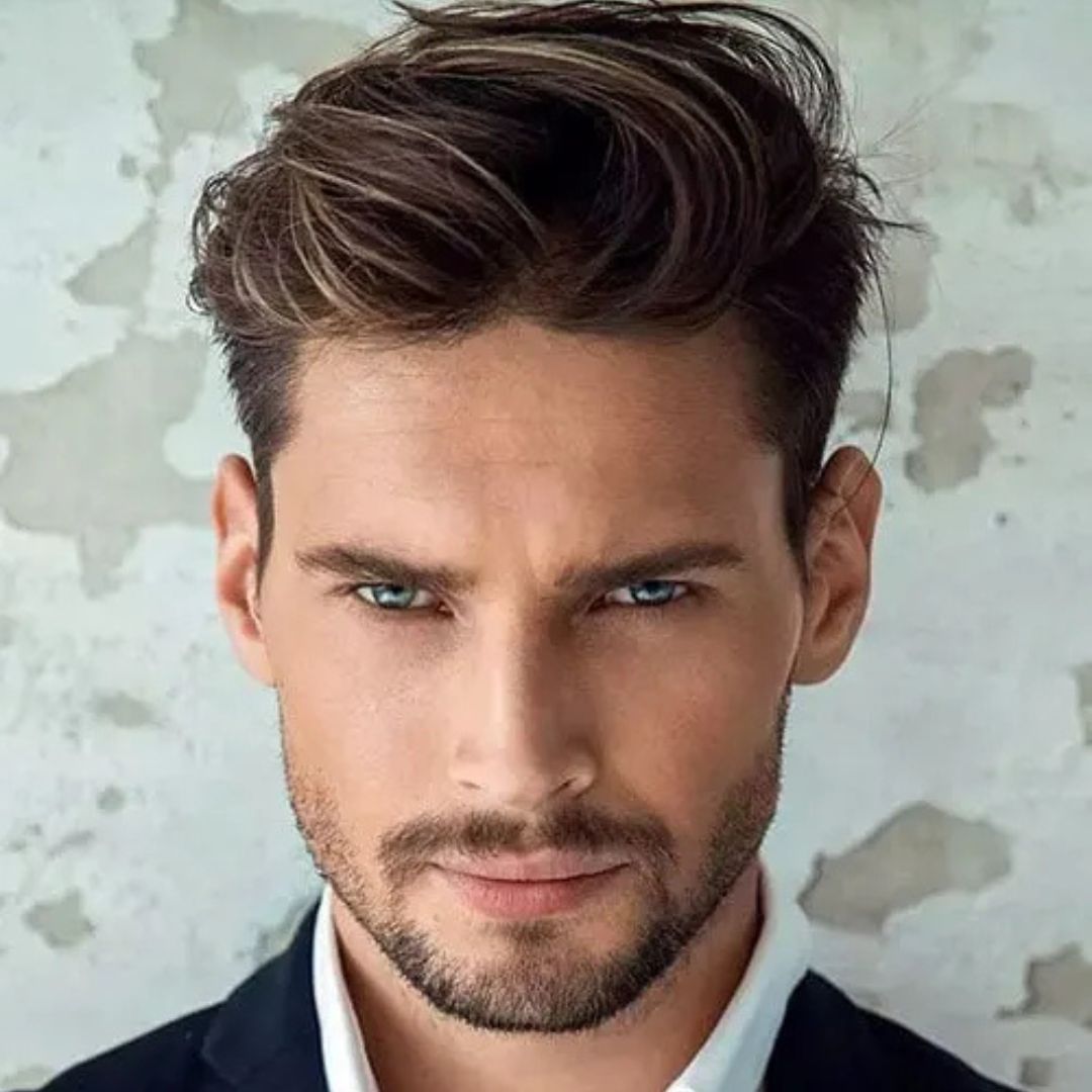 Medium-length hair grows and falls naturally with little styling due to natural tousled waves. Sprays of light sea salt or cream are added to improve the texture without losing their softness and volume. This natural look of the face is easy, and it flattens the forehead and forms a unity with a slimmer chin. It is ideal to wear daily, and it has a masculine, easy-going feel. The hairstyle takes very little care,e yt it appears fashionable when the layers are cut now and then. Natural tousled waves are the best fit for men who want to wear a carefree and casual look without losing the cleanliness of their look and proportionality to the shape of an inverted triangle face.