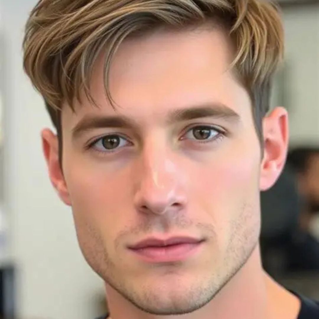 The textured side section is ideal for counterbalancing a broad forehead. The hair on the middle and slightly off-centre is parted with some natural volume and movement provided by layers. The angular forehead becomes softened in this style, and the emphasis is placed on the texture of the hair. A light styling cream/mousse will come in handy to provide shape to the waves, and not to stiffen the hair. The hairstyle is suitable both in a business meeting and in a personal outing. With the sides being moderately tapered and the top having a texture, the face looks more balanced and proportionate, with the waves giving it a relaxed and modern appearance, which can be used daily.