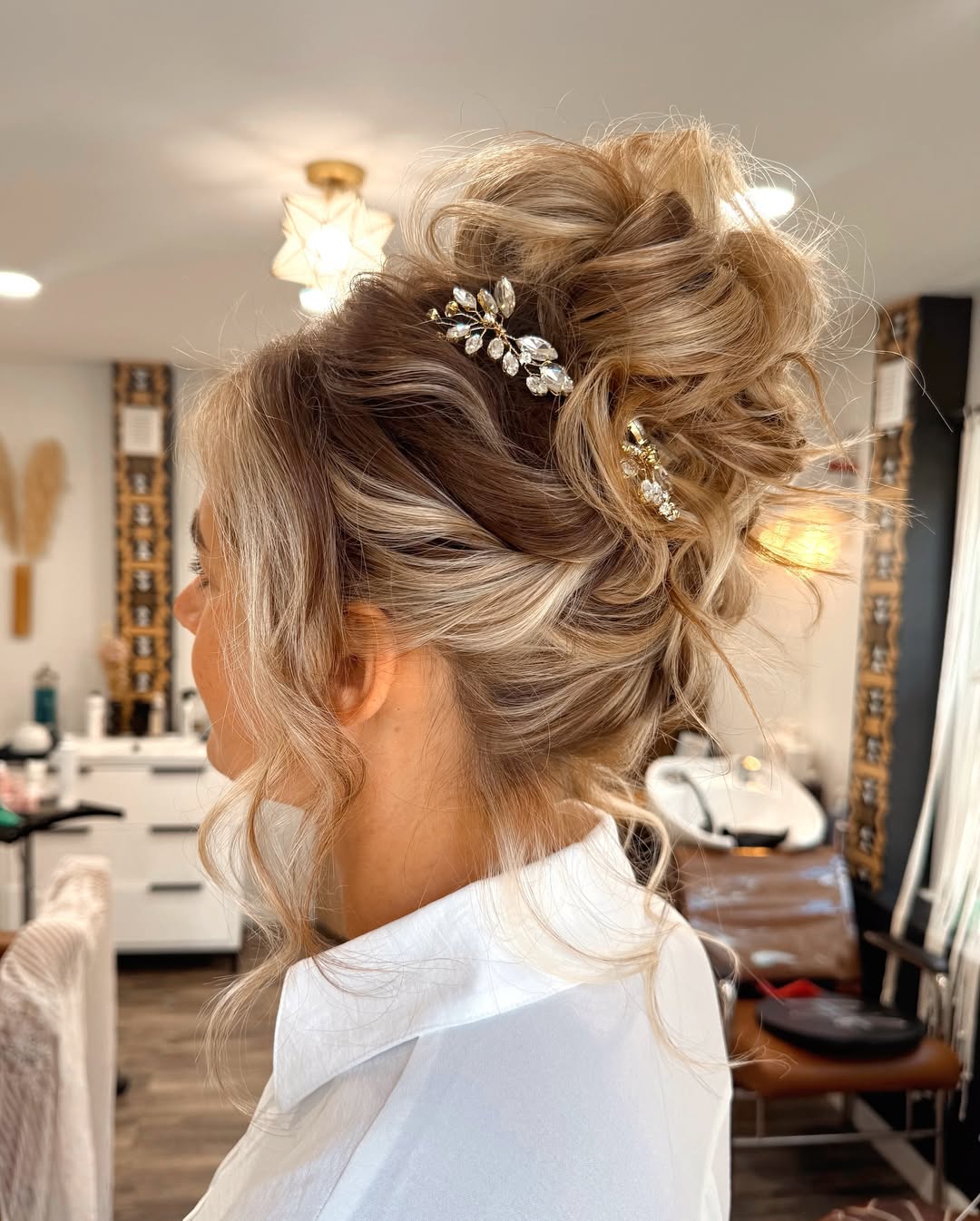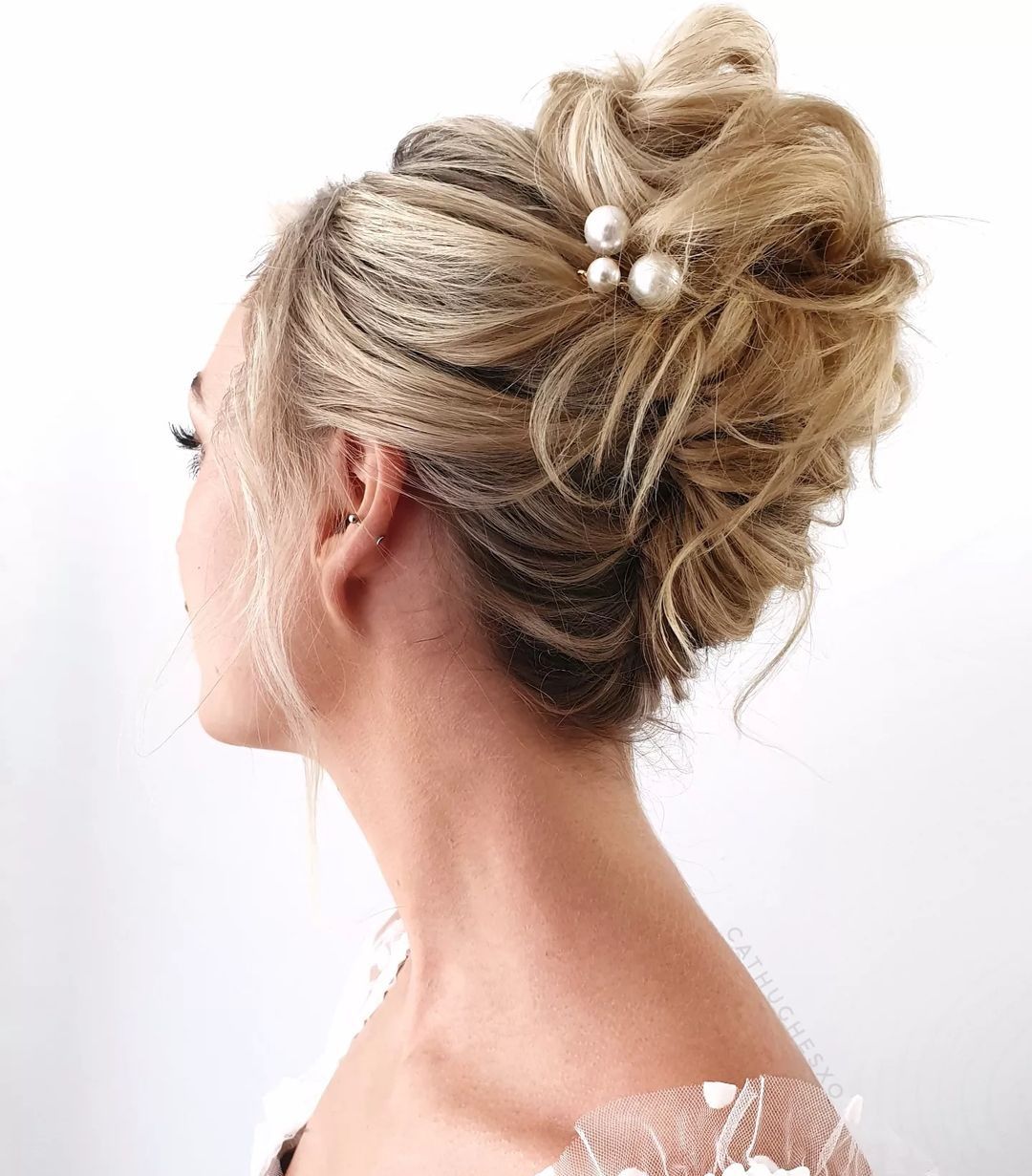 It is a casual interpretation of the classic French Twist. The hair is cascaded and twisted, hence loose, with the soft strands deposited on the face. It has a romantic and classy look without appearing to be extremely polished. Crown teasing, which is light, also contributes to the volume and is appropriate during weddings, formal dinners, or even engagement parties. It can be used with simple pearl pins or very few accessories to add a chic touch. This appearance is in harmony with long, layered hair, and almost any face shapes are suitable. It is plain, elegant, and eternal.