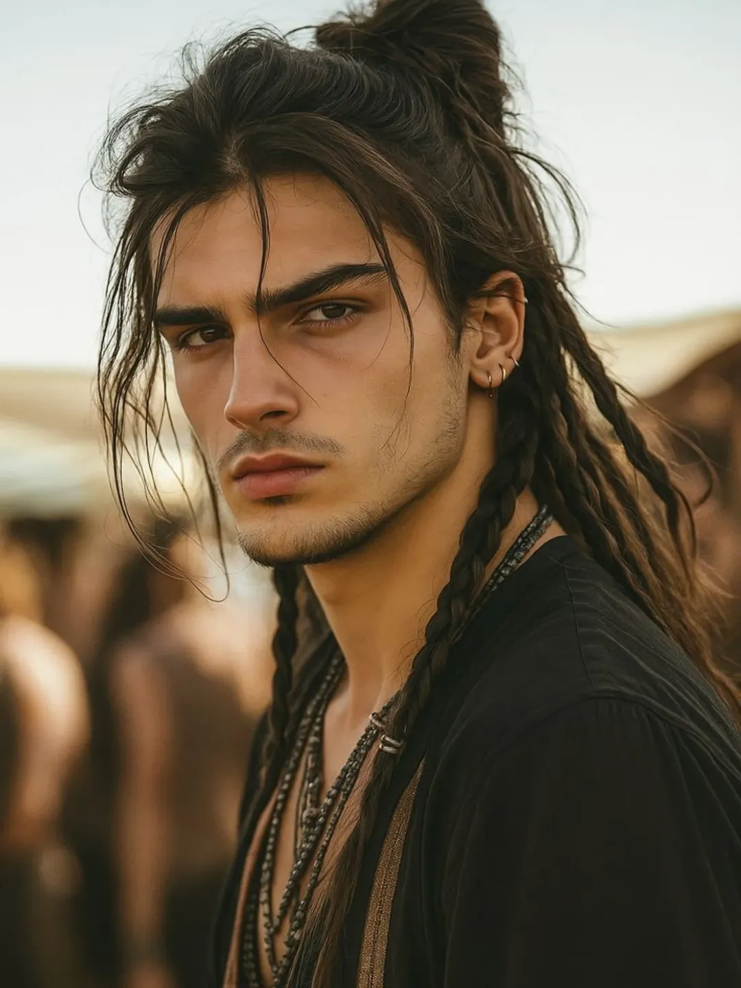 The half-up, half-down Viking hairstyle is convenient and fashionable. The upper portion of the hair is pulled to the back of the head in the form of a ponytail or bun, and the rest is left to flow freely over the shoulders. This produces great contrast and prevents hair from getting in the face, and displays length. Extra details and authenticity can be placed on the top portion with braids or leather ties. The style is ideal for men with medium-length and long hair, and is ideal with a thick beard. It suits any casual and informal occasion where one wants a versatile style that can shift between the casual and formal environments.