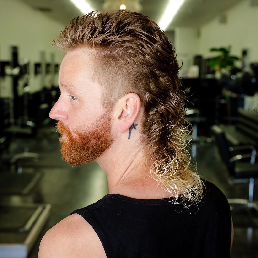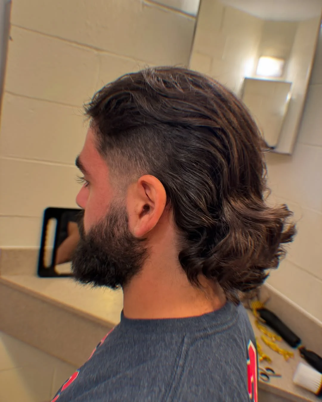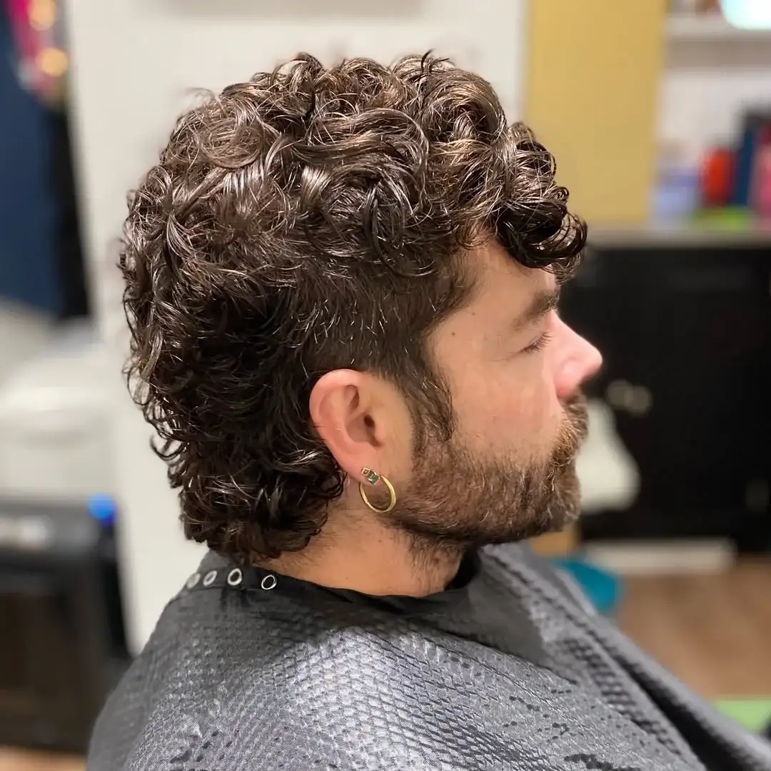 The thick-bearded curly mullet suits the men with their natural curly or wavy hair. This hairstyle is a way of embracing this texture rather than rejecting it because the curls are allowed to provide volume and personality to the shape of a mullet. Tck long curls give an eye-catching and dramatic appearance, and the thick beard gives the hairstyle a balance and masculine touch. Curl-enhancing cream or lightweight products that are used to define the curls and minimize frizz can be used. The style fits well with men who desire a daring and self-assured hairstyle with a tendency to enhance their natural hair texture.