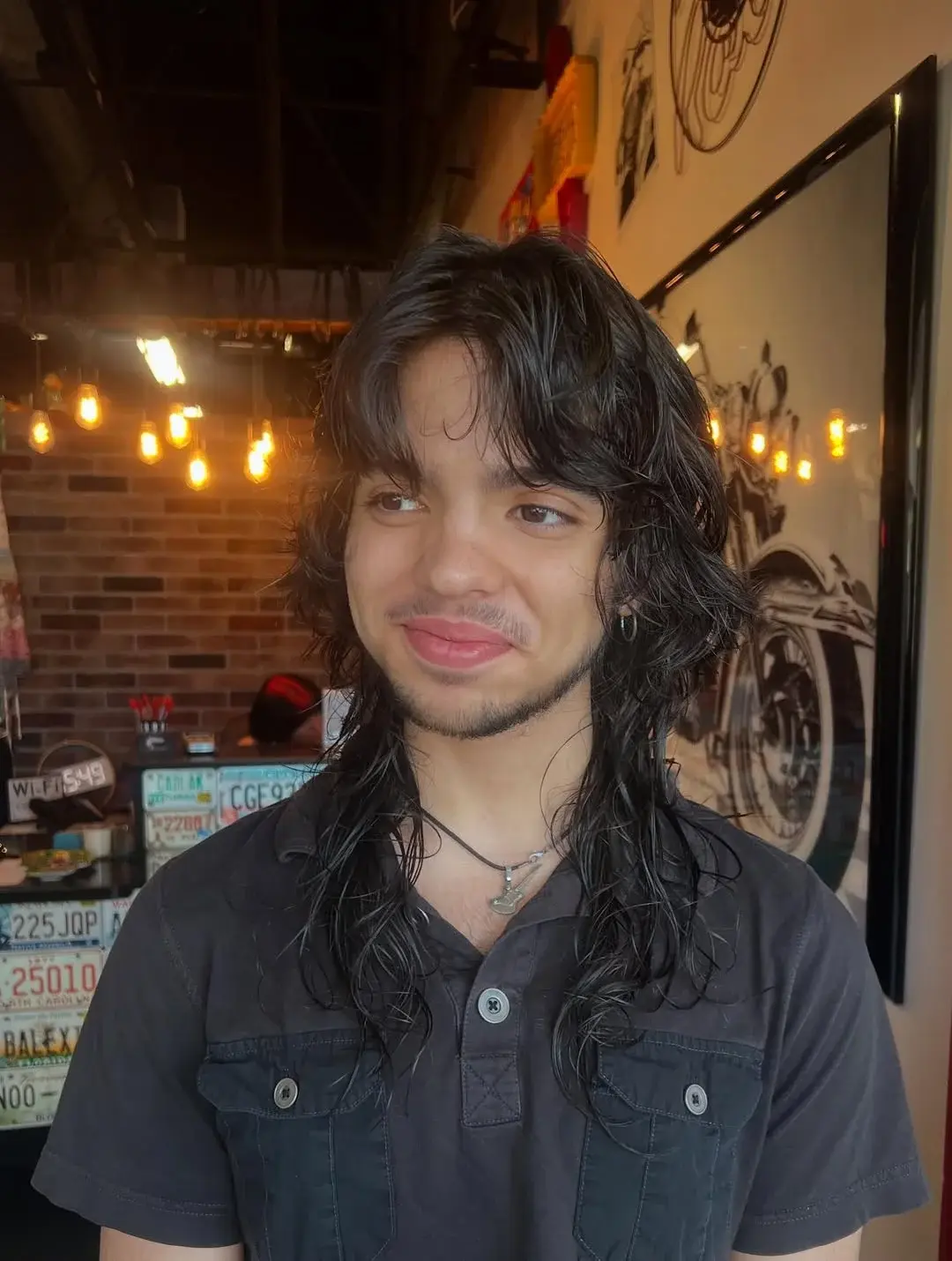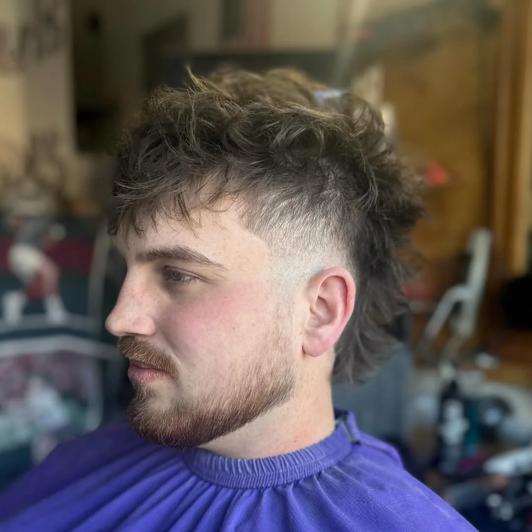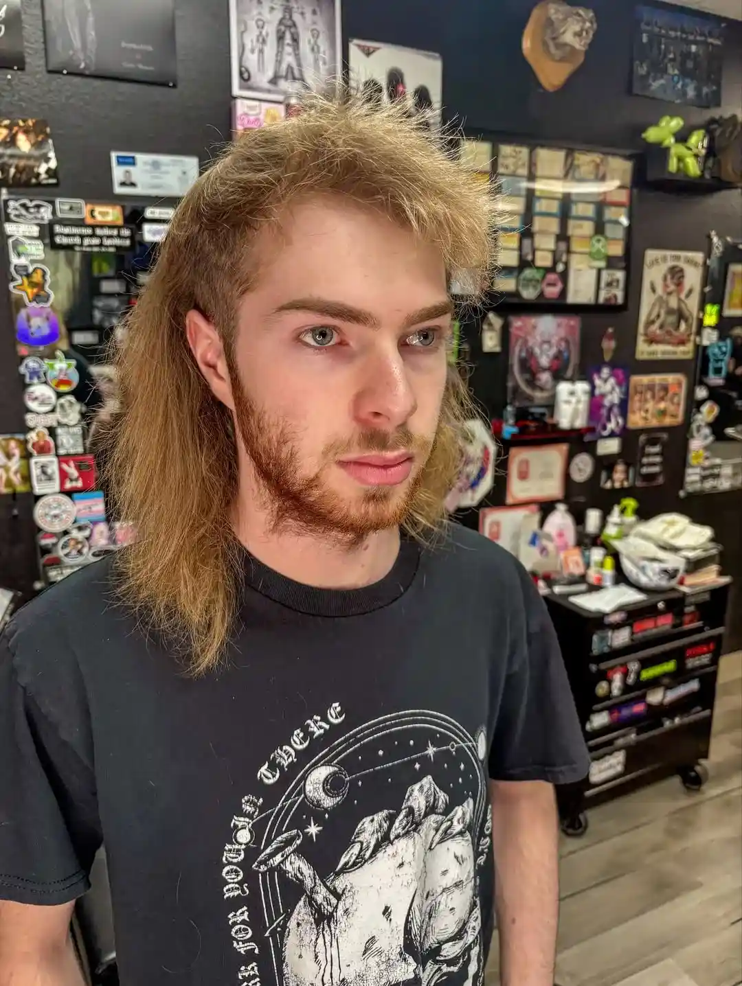 The thick-bearded curly mullet suits the men with their natural curly or wavy hair. This hairstyle is a way of embracing this texture rather than rejecting it because the curls are allowed to provide volume and personality to the shape of a mullet. Tck long curls give an eye-catching and dramatic appearance, and the thick beard gives the hairstyle a balance and masculine touch. Curl-enhancing cream or lightweight products that are used to define the curls and minimize frizz can be used. The style fits well with men who desire a daring and self-assured hairstyle with a tendency to enhance their natural hair texture.