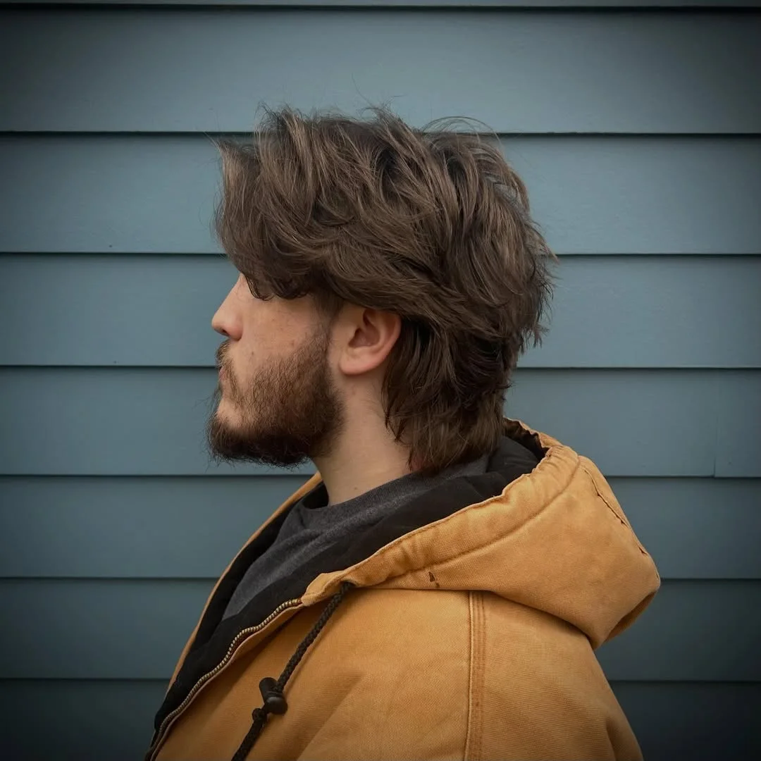 The groomed beard and layered mullet inspire a modern and cool hairstyle for the male gender. The haircut is multi-layered,ered giving depth and dimension to the hair, particularly in the longer back part. These layers give the hair fullness and dynamism. It has a well-cut beard that brings contrast and maintains the general appearance. This is a good style for men who would like to look fashionable with the mullet but at the same time appear clean and refined. Frequent cuts and good hair care will assist in maintaining the separation of the layers and make the beard look sharp.