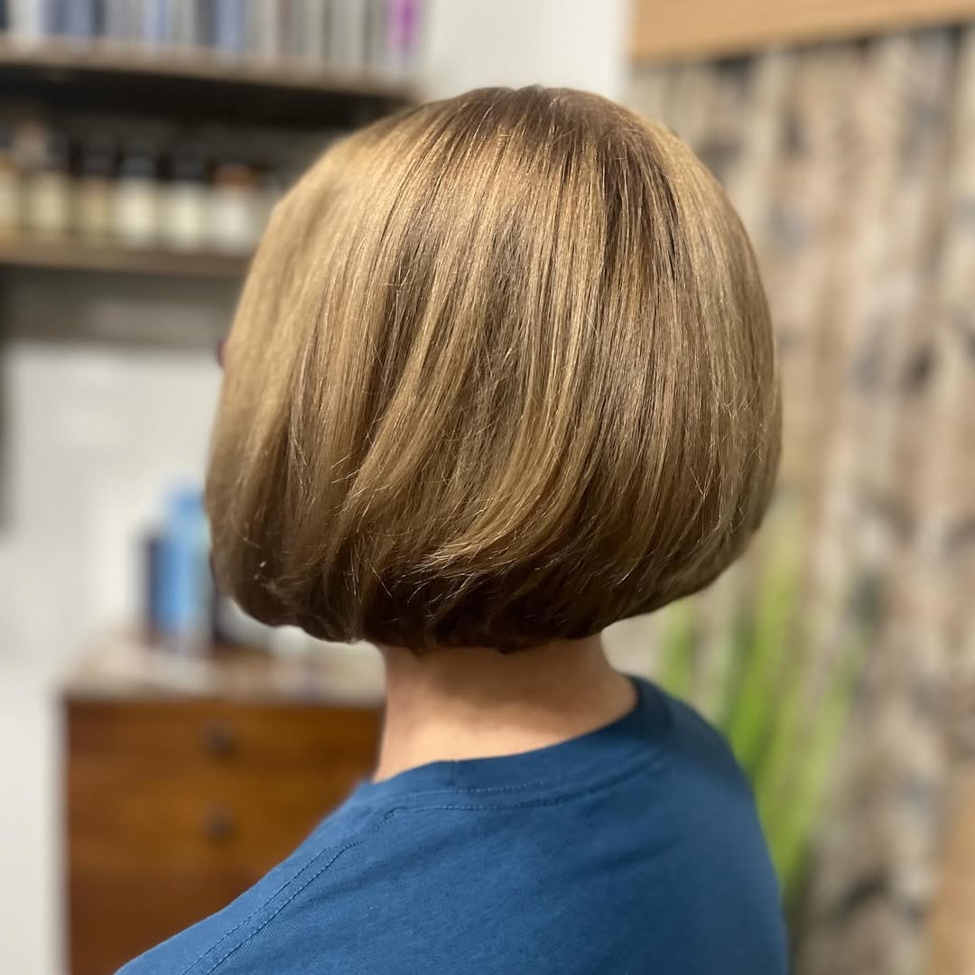 - Use a round brush to blow-dry the hair at the top and inwards at the ends.