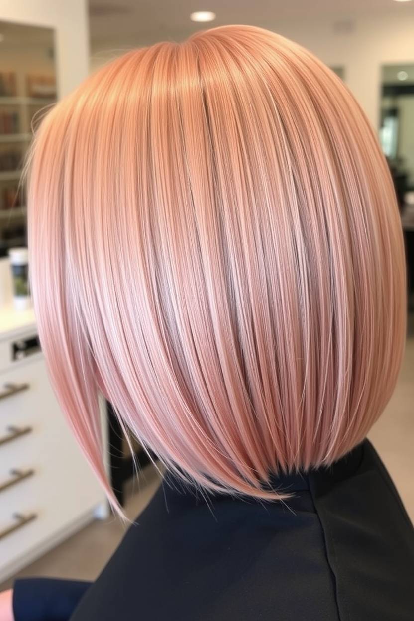 This one’s for my sleek and stylish ladies — the blunt bob in rose gold blonde. I remember cutting this for a client who was going to her granddaughter’s wedding. She wanted something “modern but not trying too hard.” We went sharp with the cut, just grazing the jawline, and softened it with rose gold blonde tones. When she walked into the salon the next week, she told me she felt like the “cool grandma” at the wedding.