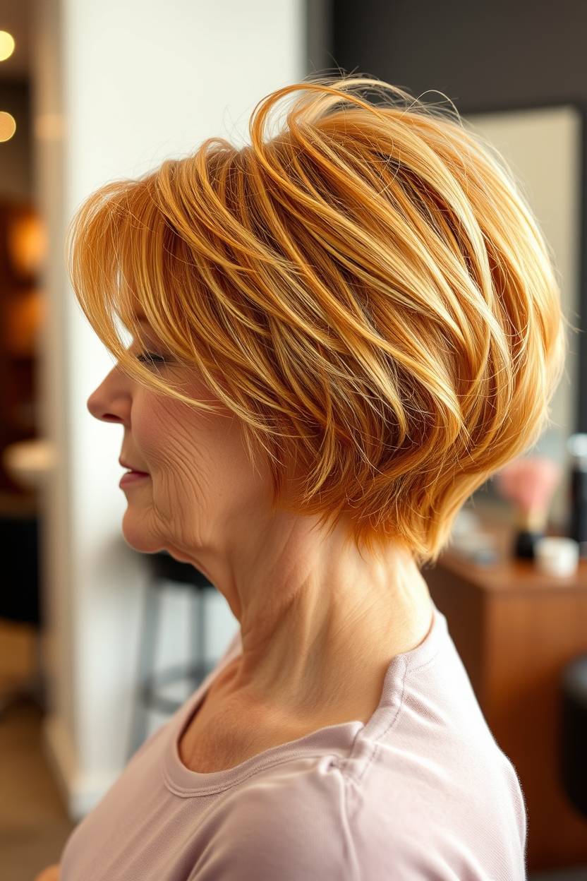 Now, the golden red blonde pixie is for women who want to turn heads without even trying. I remember cutting this on my friend who’d just retired — she told me, “I want something that says I’m free now.” We went short, textured, and added a golden red blonde tone that looked like the sunrise. She left the salon tossing her head like she was 25 again.