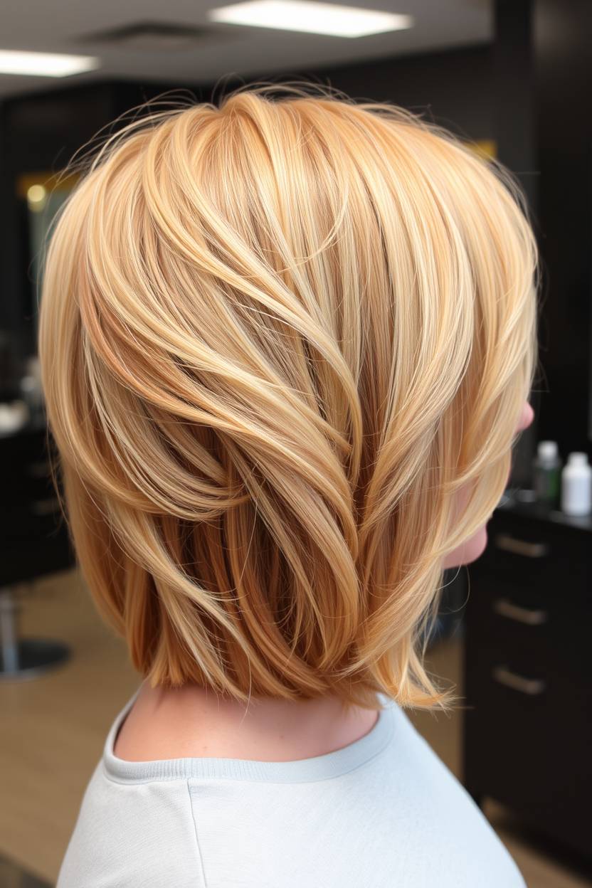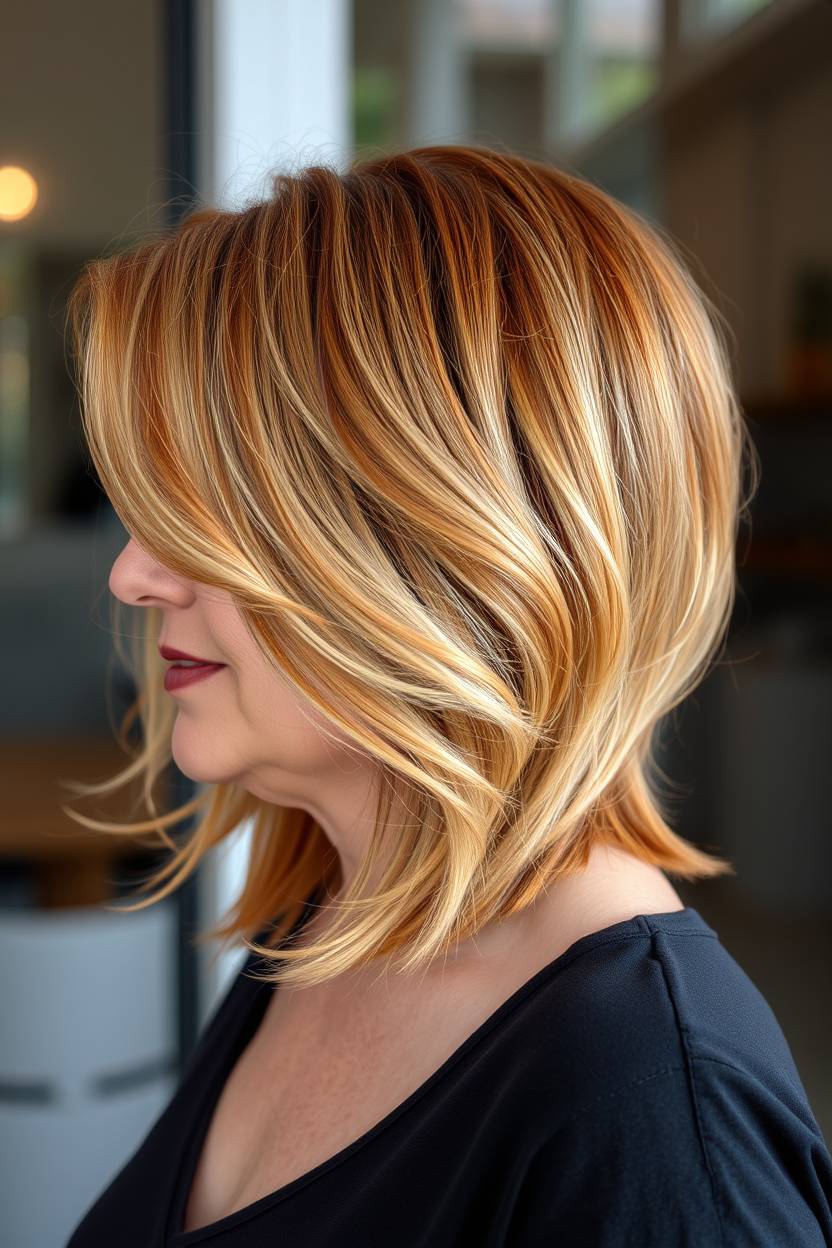 The layered copper blonde lob is a personal favorite because of how it balances elegance with a little bit of sass. I had one client who swore she’d look “too loud” in copper — we tried it anyway, and she sent me photos the next week of strangers complimenting her hair in the grocery store. The copper warmth mixed with blonde ribbons gives this incredible dimension, like sunlight’s always following you around.