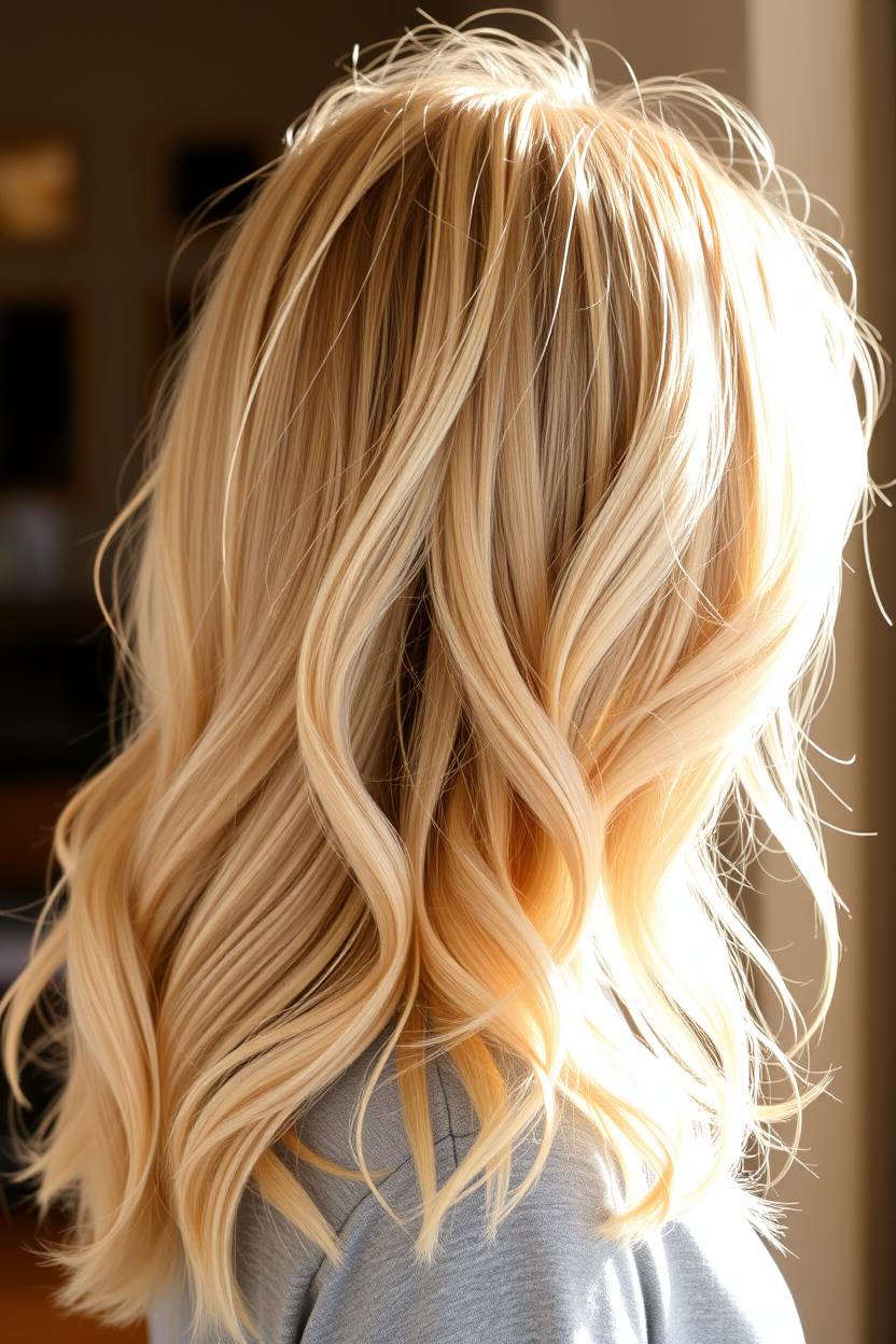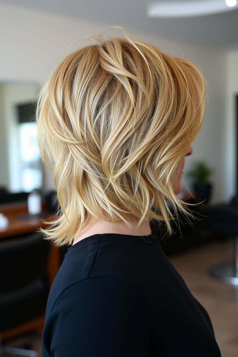 This style has lots of layers, feathered ends, and that perfect “messy but not messy” look. The light auburn blonde color adds depth while still keeping it bright around the face. I usually style it with a little texture spray and a scrunch — no perfect curls here. To be fair, it’s one of those cuts that looks even better the day after you wash it, which is a win for anyone who doesn’t want to fuss daily.