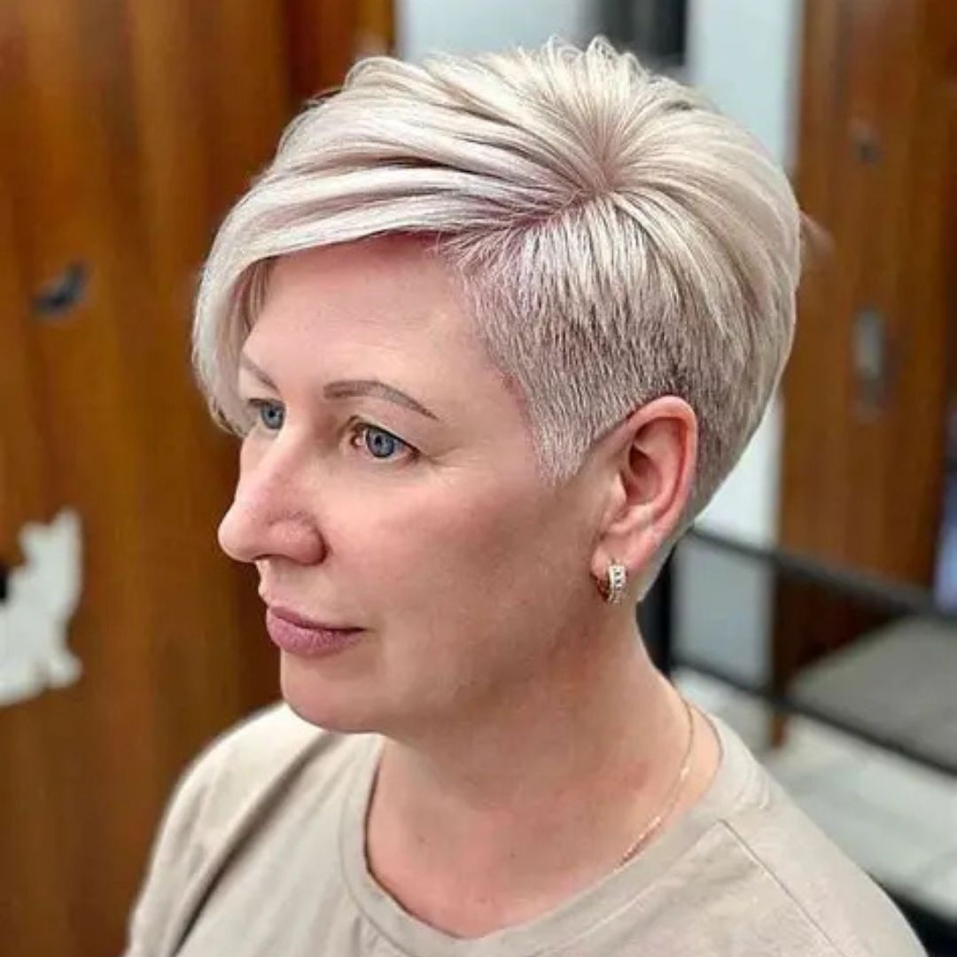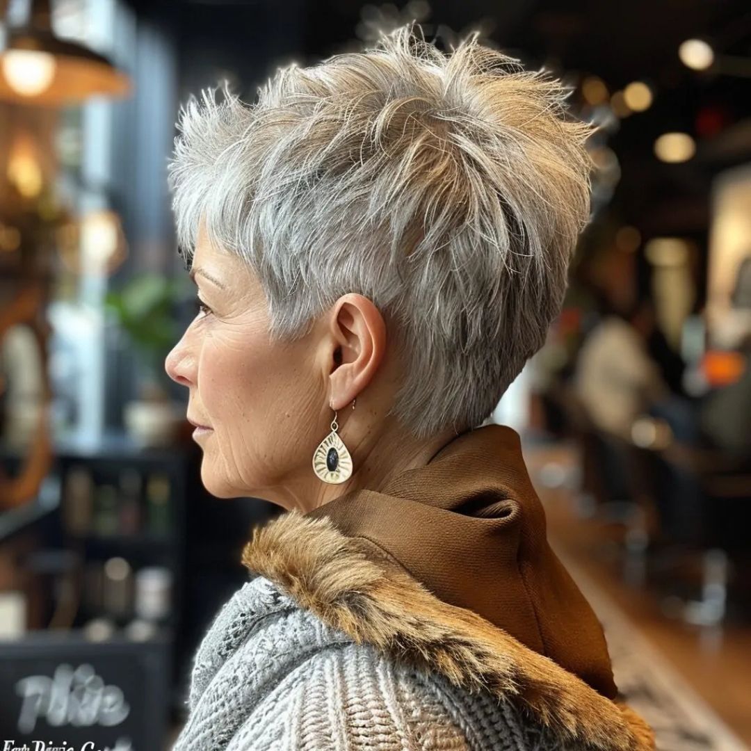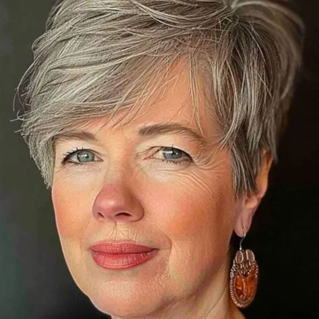 The classic side part pixie is a time-tested choice that is not only classy but also manageable. The illusion of thicker hair is created by hair with shorter sides and back with somewhat longer top layers. The side part covers the face and provides a minor sophistication. It is easy to style, either air-dry or apply a lightweight mousse to create the texture. This cut suits every shape of the face, and it works best with seniors who prefer the polished and yet plain look with no daily flaunting. Its shape is ensured by regular trims, which are done every 4-6 weeks.