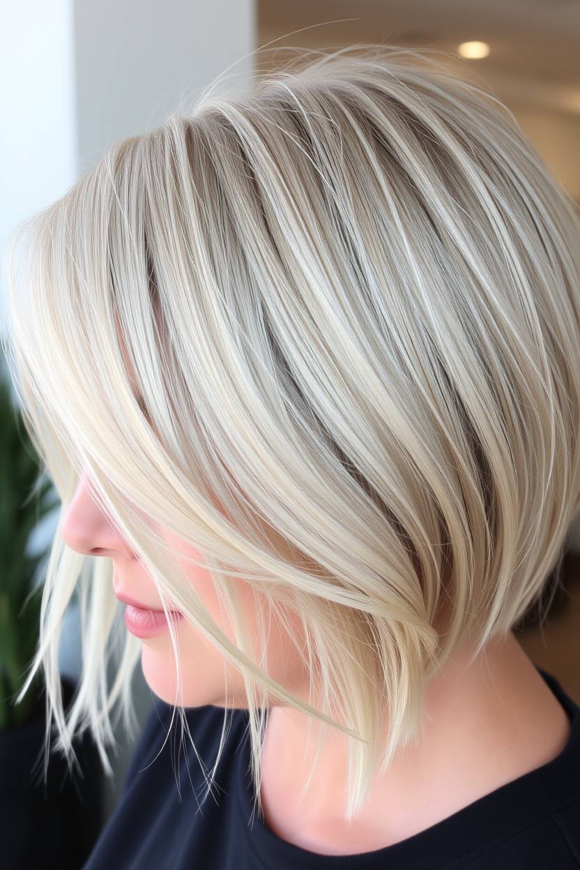A sleek straight bob in platinum blonde is bold and fashion-forward. It creates a striking contrast and brightens the face, ideal for women who love to make a statement.