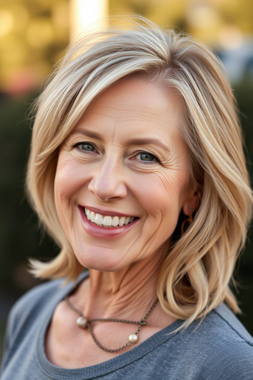 A shaggy bob with warm blonde tones adds softness and a touch of fun. The messy layers give it a modern edge while still looking age-appropriate and elegant.