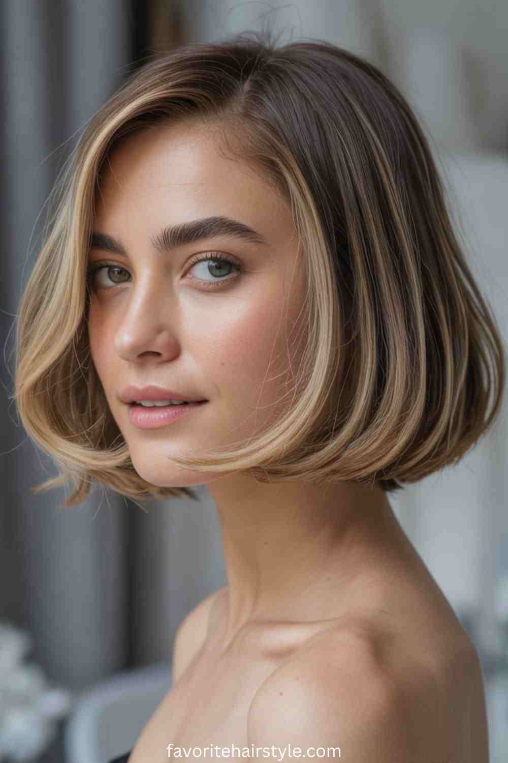 The timeless bob haircut paired with dirty blonde highlights creates a sleek, sophisticated look that never goes out of style. This combination adds dimension to the hair while keeping the style polished and easy to maintain.