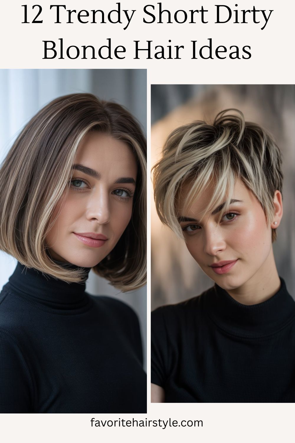 Popular short hairstyles for dirty blonde hair include textured pixie cuts, classic bobs, wavy lobs, and layered crops. These styles enhance the multidimensional color and add movement and volume to the hair.
