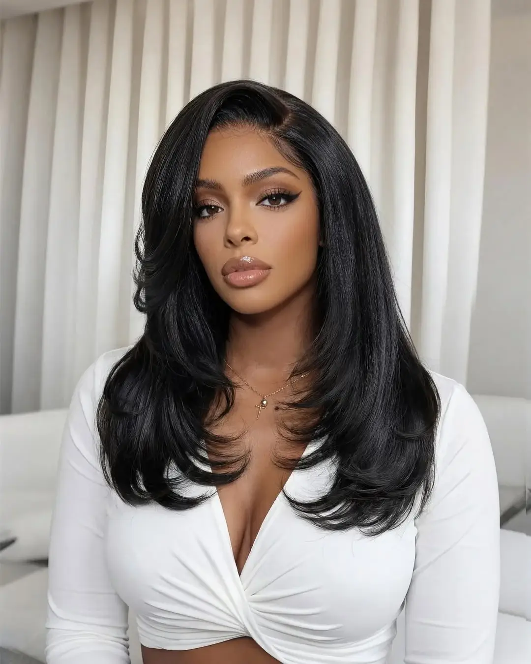 This is a hairstyle that emphasizes attaining a sleek and shiny appearance. The straight lob is straightened using a flat iron and is completed with serum shine to make it look better. This gives it a smooth and opulent touch. It suits best for a formal occasion, a party, or a special event. The smooth touch makes the hair appear healthy and well taken care of. This is an easy style but very graceful in nature and is quite befitting to those female individuals who are fond of a classic and sophisticated appearance.