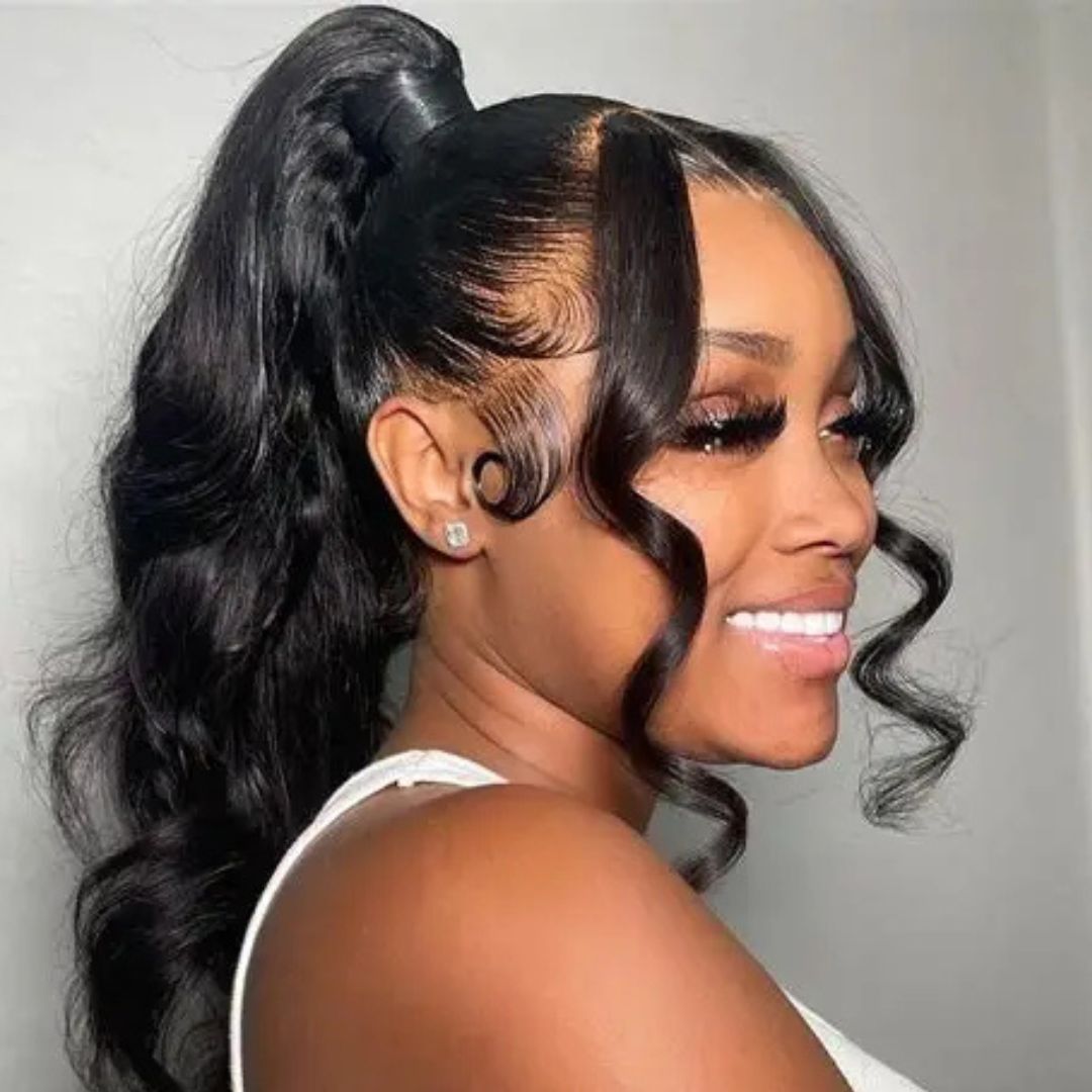 Ponytail is high, a nd the front is done in a style to present a bold and trendy look. Part the front hair in soft curls, sleek side parts, or tease the front hair lightlytoo give an added amount of volume before tying the ponytail. The trend of high ponytails is popularized by such famous personalities as Ariana Grande, which is why it became trendy and iconic. This hairdo pulls your face up and puts your features into prominence. It is the ideal one in case of parties, dances, or even informal outings. Apply hair accessories or tie a strand around the hair tie to give it a nice, modern look.