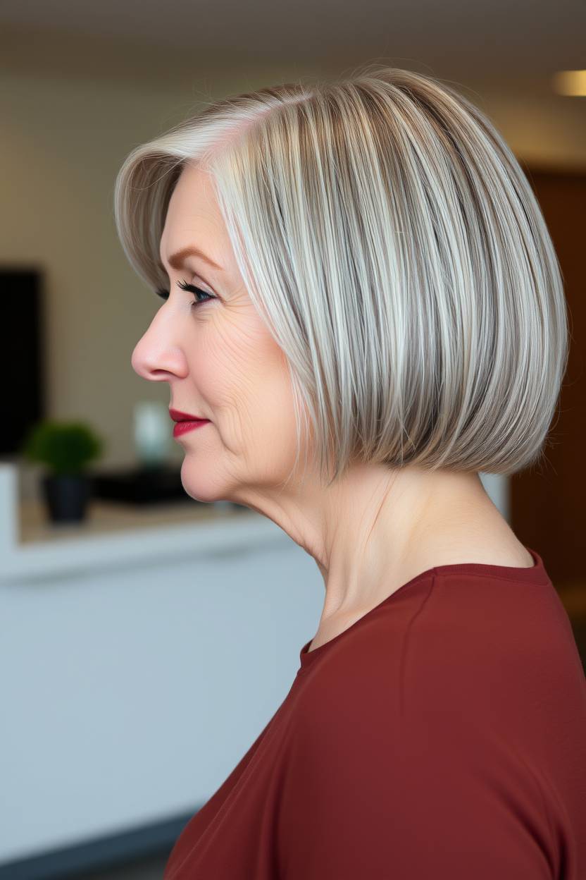 It’s a fun one because older women sometimes feel like they “shouldn’t” go edgy, but in my opinion, that’s nonsense. If you want it, wear it. Styling doesn’t need to be complicated either—a side part, a smoothing serum, maybe a flat iron for a polished look. It just screams confidence without being over the top.