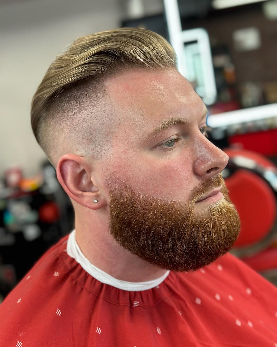 The cut is a faded Viking, a blend of a sharp fade, along with a short, textured hairstyle on top. The shades of redness on the sides of the face and the top in several layers only accentuate the features of the face, preserving a distinctly Viking appearance. This haircut is very versatile for various textures and lengths of hair, thus suitable for both men and women. The styling can be unkempt and dishevelled, or slick and smooth. It can also be supplemented with subtle line patterns or braids to add more of the Viking ambiance. The faded Viking cut is a contemporary style of traditional Viking hairstyles with an aggressive twist.