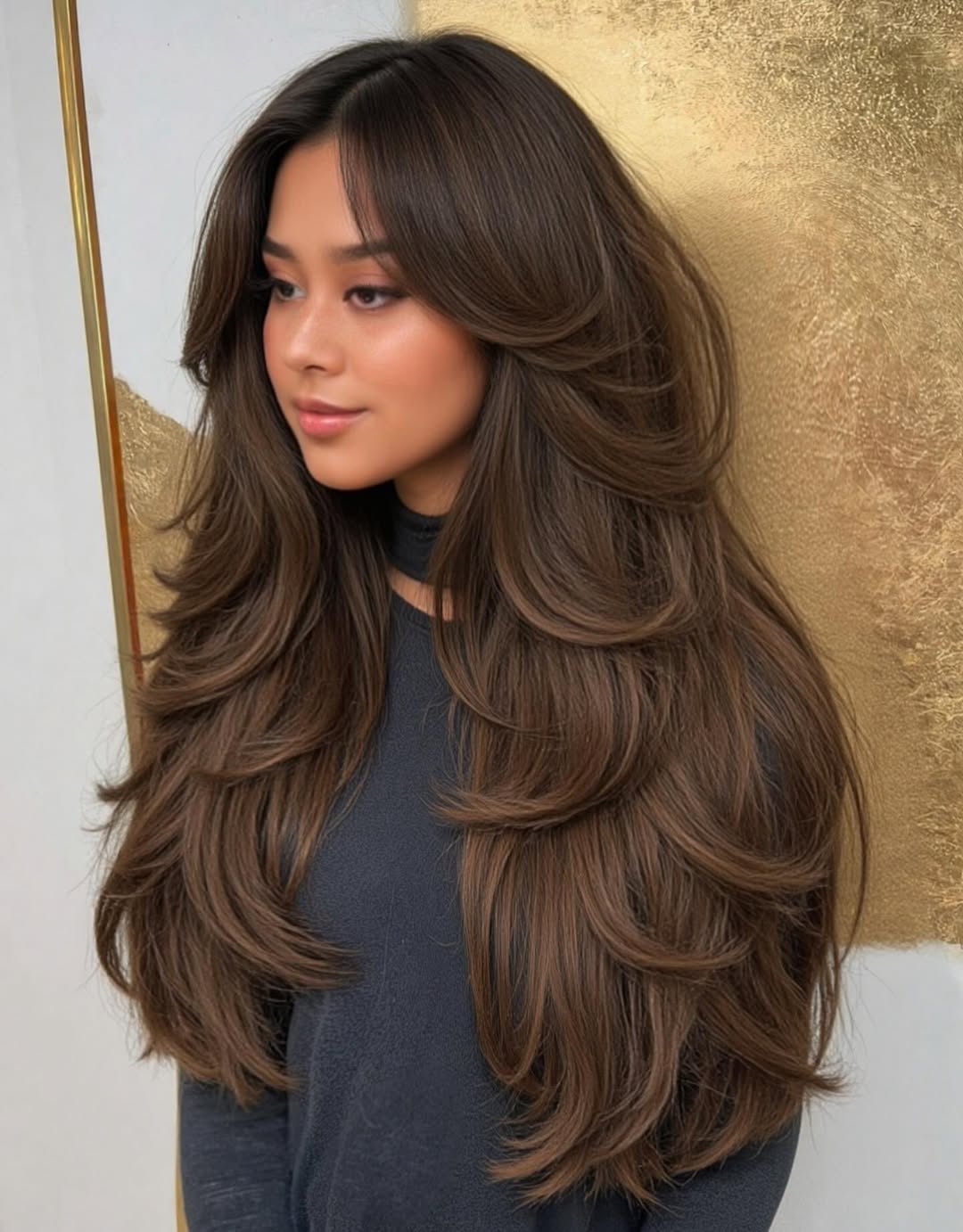 Fringed, fluffy waves provide a shape and a depth to your hair. These bangs are light and airy because of the use of soft layers, which are ideal in medium or long hair. They are mixed in a great way with layered cuts, and this adds volume and motion. Hair is also made fuller with layered wispy bangs, which do well with thin or fine hair. The hairstyles are not rigid–you can straighten them to be smooth or make them a bit wavy to be more of a plaything. They can be applied to almost any face shape, and they soften the angularity of the shape, besides beautifully encircling the eyes. The layers can be further enhanced with the addition of minor highlights.