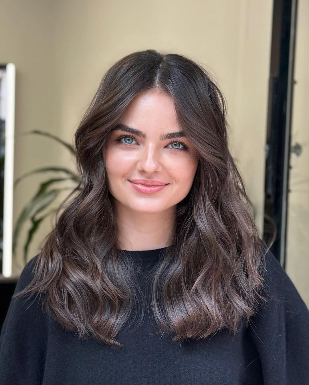 Layers and waves combined with curtain bangs provide a comfortable, voluminous, and flattering style to the face. Layers do not make the hair look heavy, and the waves provide dynamism and texture to the hair, which makes the face look slim. The forelock is framed by curtain bangs that put your cheeks and forehead in a natural setting and do not overpower your round face. The hairstyle can be styled on medium-length to long hair and is suitable both in day-to-day and in special events. Depending on the amount of styling tools used, it gives a casual, relaxed feeling or a smoother and more glamorous appearance, thus making it one of the most versatile styles of hair among women with round face shapes.