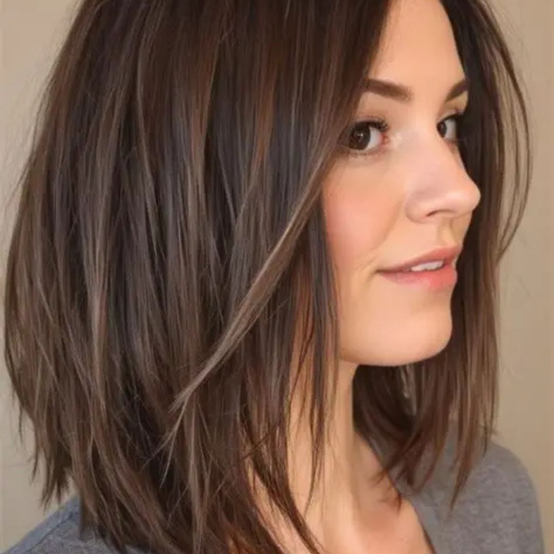 Layered lob is a mix between the sophistication of the long bob and the dimension of layers. The layered lob is worn just above the shoulder, ers and the slight layers are put around the face to make it flattering and elongated. It is applicable to straight, wavy, or slightly curly hair and provides a modern and chic appearance that is appropriate both at work and on social occasions. Layers decrease heaviness and increase the movement of the hair, which makes the style seem to be alive and have body. Layered lob is convenient to care for, comfortable, and it suits women with a long oval face who desire to have a sleek, polished hairstyle without having to apply so much effort in styling the hair.