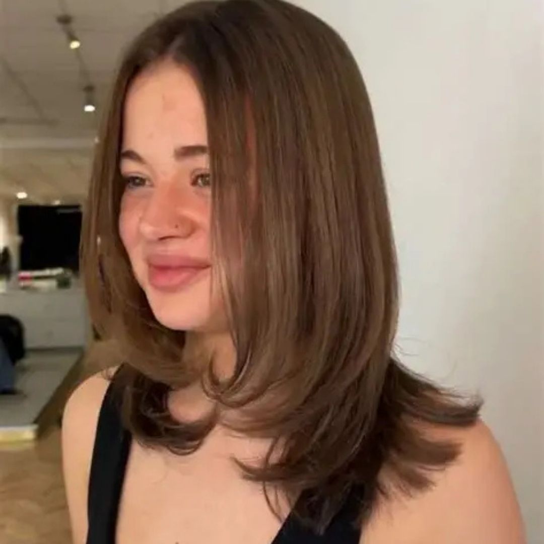 A soft, rectangular face is balanced and symmetrical with long and plentiful, shoulder-length hair separated into a middle part. Layers on both sides of the face make the jawline less hard and do not make the face flat or long. It is a very basic yet classy hairstyle that suits straight, wavy, or curly hair. It is inexpensive and flexible, which can be used during casual, professional, or formal events. The use of light or dark shades adds texture and depth. The natural look of the face is provided by the middle-part layered style, which provides a clean and flattering appearance to the face, without taking over the features.