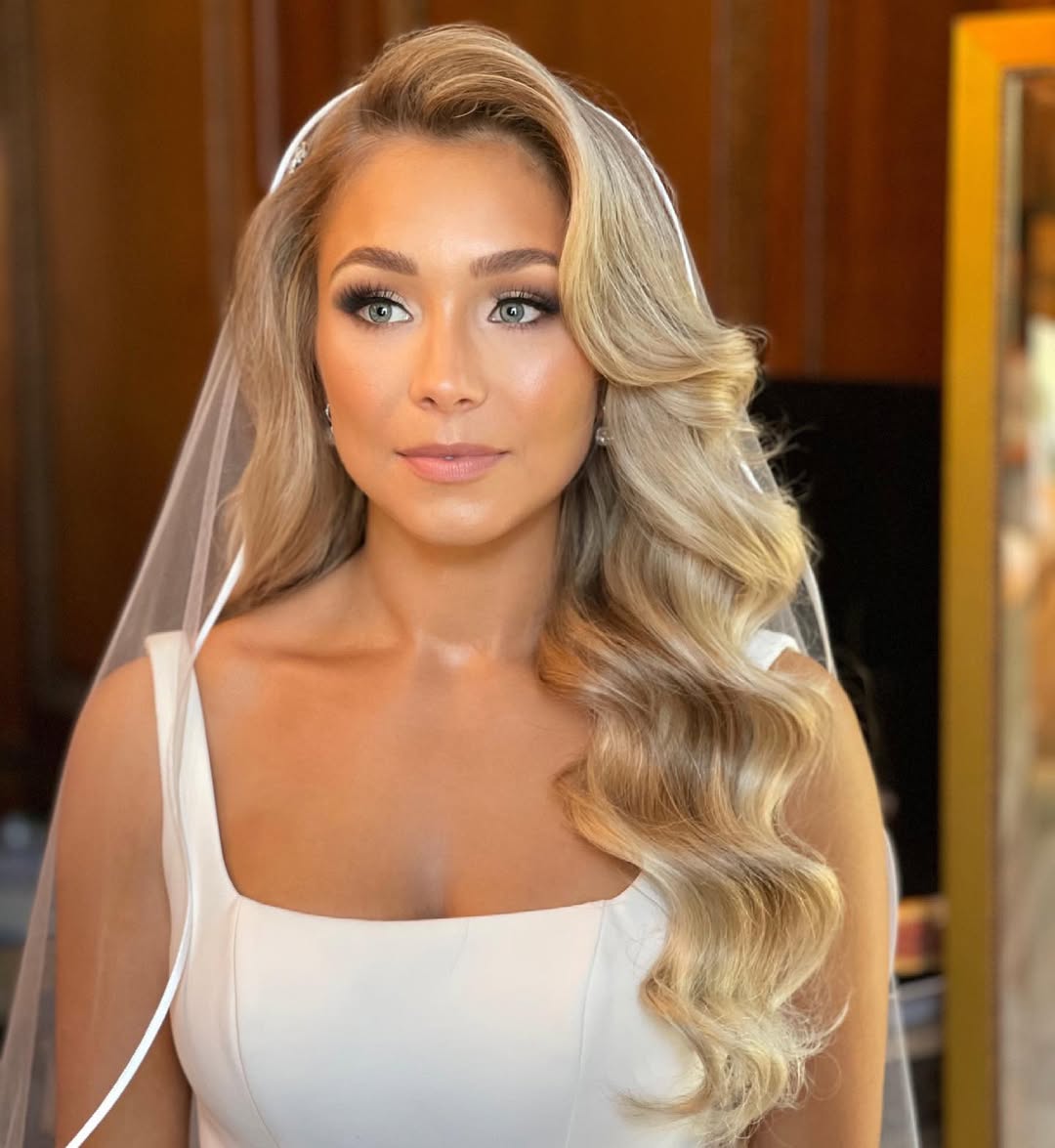Brideal or engagement.No hair. The side-parted waves are beautiful on the romantic side. The soft waves make a picturesque complement to the shape of the face, providing grace and beauty. Deep side part brings to the fore eyes and cheekbones, making the face look longer and thinner. The hair accessories, such as pearls, flowered pins or a tiara, will complete a beautiful bridal look. This is a good match with veils and traditional or western wedding dresses. Fix the waves with a flexible hairspray to keep them in place all day. This style is perfect for a bride, bridesmaid or pre-wedding photoshoots as it is a dream, timeless beauty.