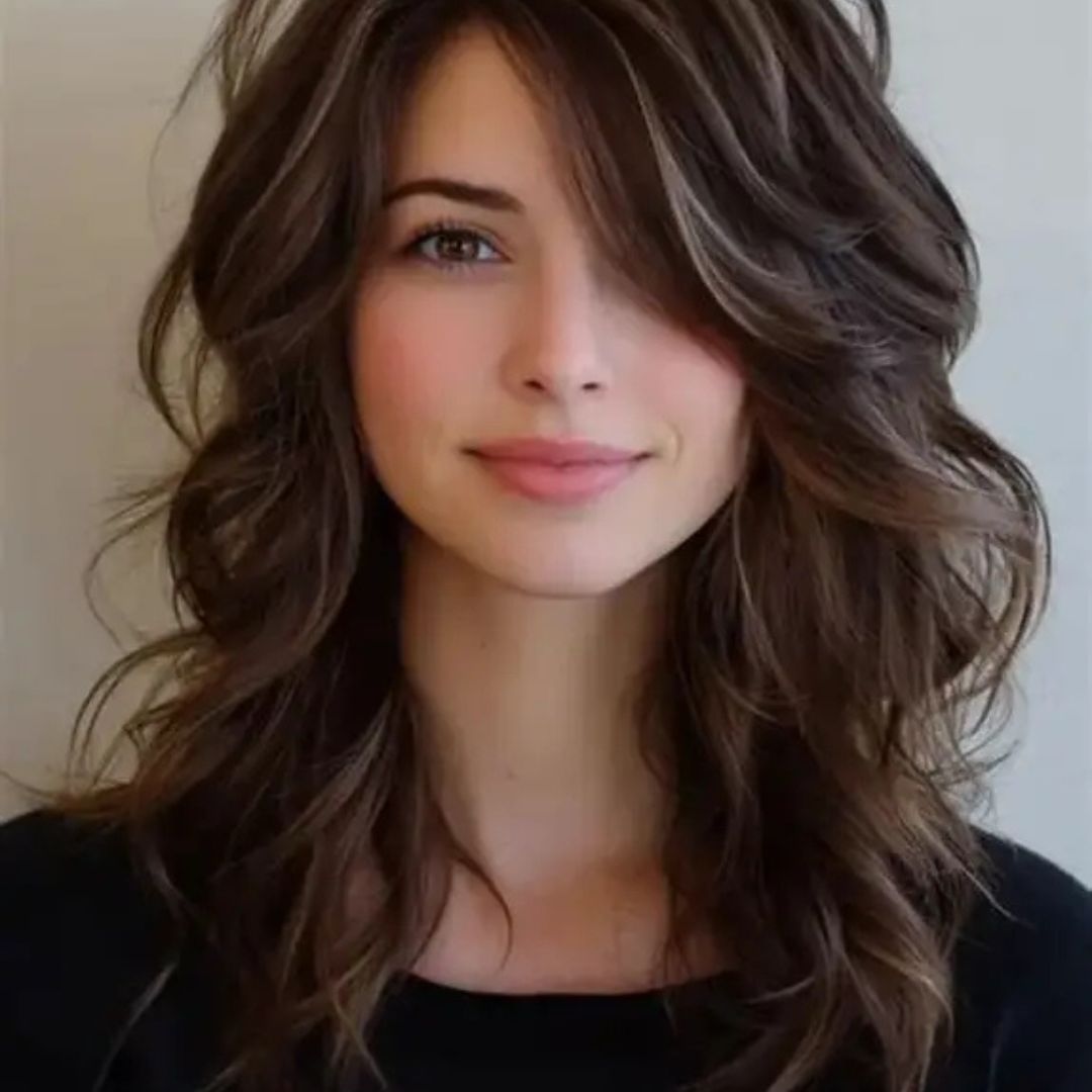 Waves swept on the sides and, with a bang, give a gentle and feminine appearance that perfectly suits round faces. The bangs are side-swept, making a iagonal line which narrows the face and focuses on the eyes. Making the two with loose waves gives them movement and shape without width. Toss the bangs and part, and run the rest of the hair in loose curls. This haircut is excellent when attending school or on workdays, or even on a date. It has a young and contemporary touch and fits medium and long hair. To achieve the most desirable effects, spray lightly to ensure that everything stays in place but without excessive effects (natural flowing).