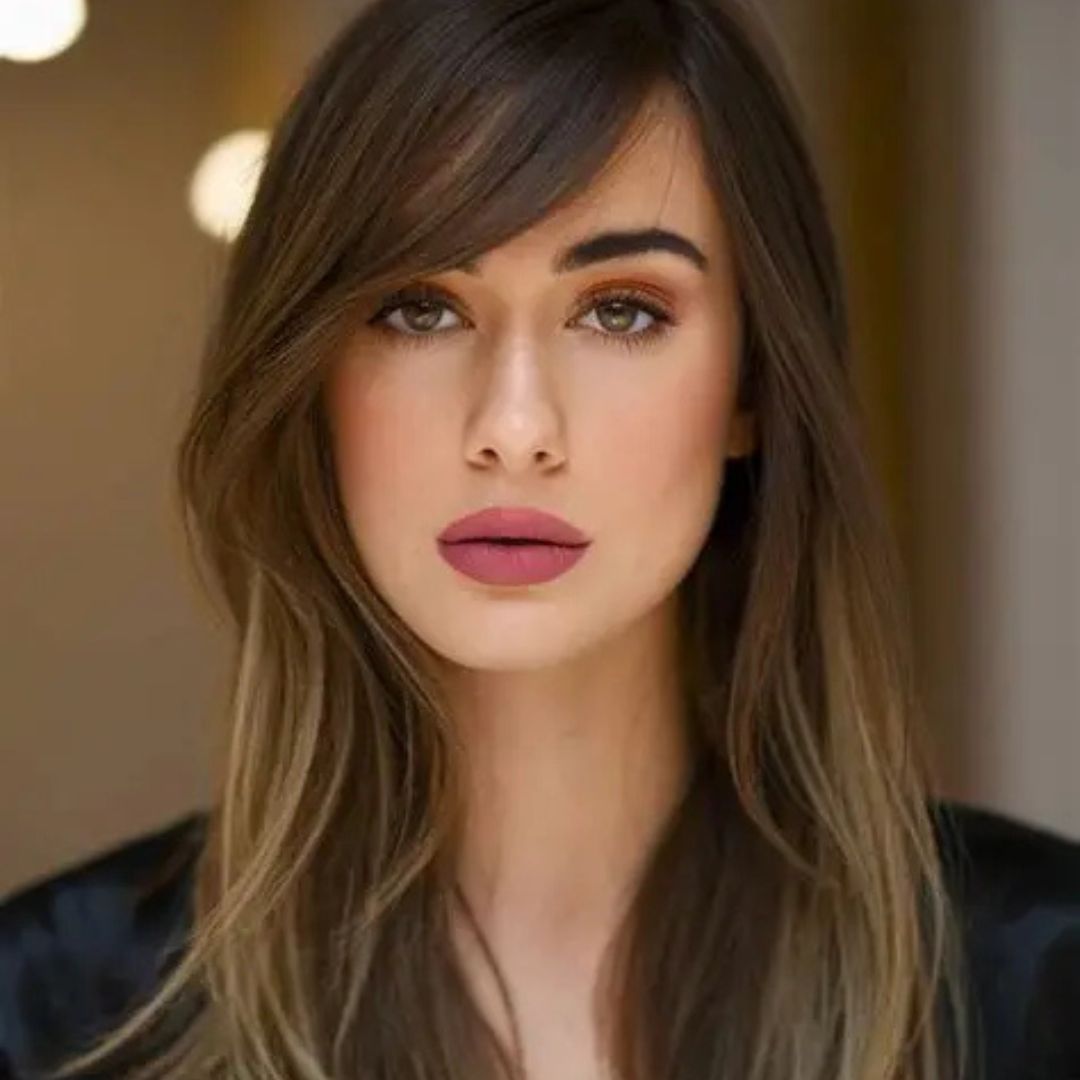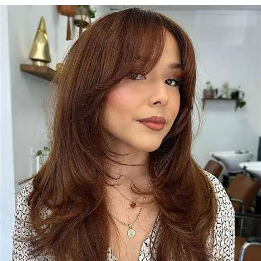 Pear-shaped faces are balanced with soft layers and side-swept bangs. The strata create dynamism and depth in the area of the face above the halfway mark, and the wider jawline is not given focus. Side-swept bangs, which gently rub cheekbones, highlight the eyes and soften the lines in the products on the face. The style is suitable for both straight and wavy hair, which is versatile. When blow-drying, styling with a round brush will keep the sweeping hair of the bangs rounded, and layers can be bent or waved to add texture, which makes the appearance of the whole look look effortlessly classy.