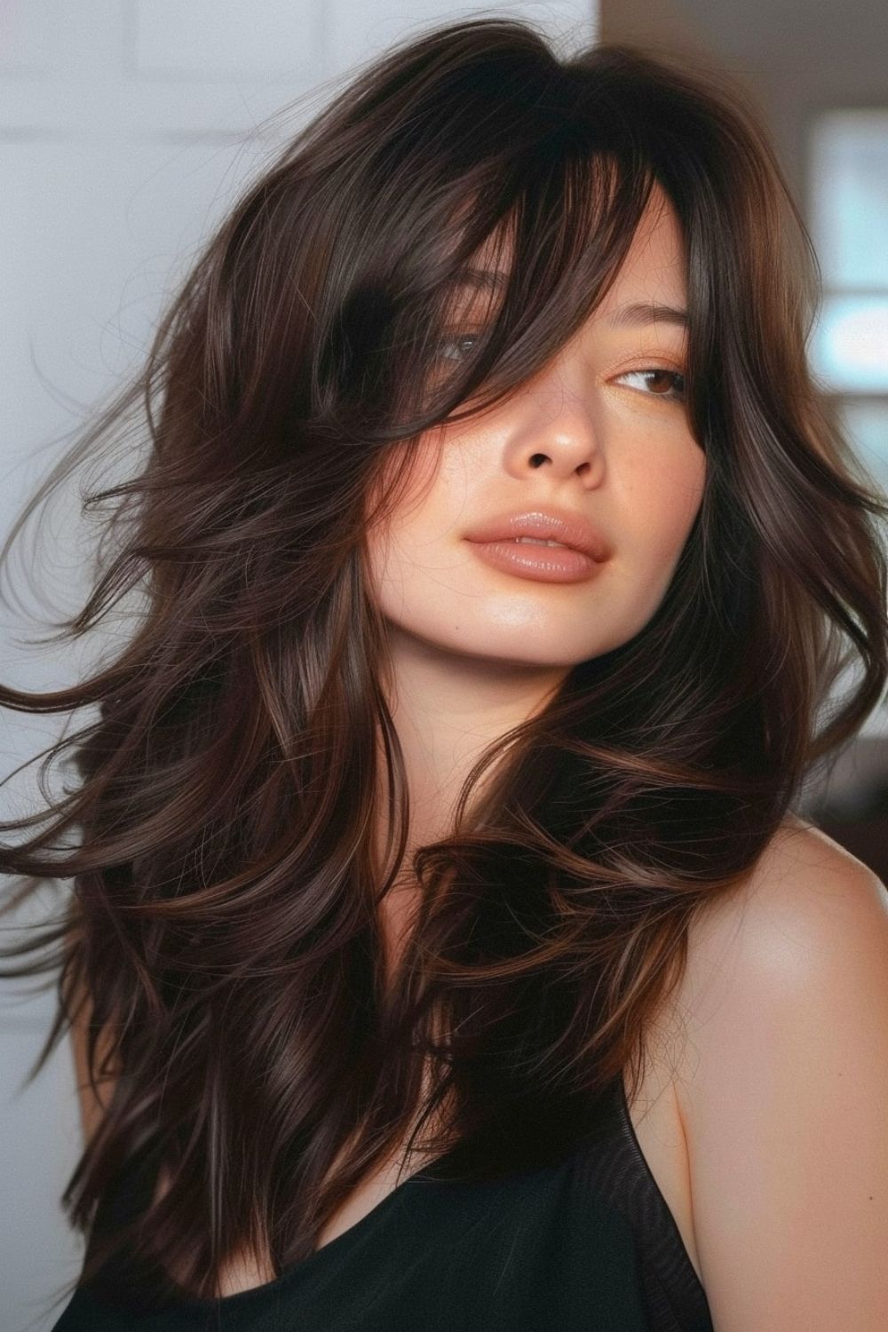 Long Layered Waves with Side-Swept Bangs