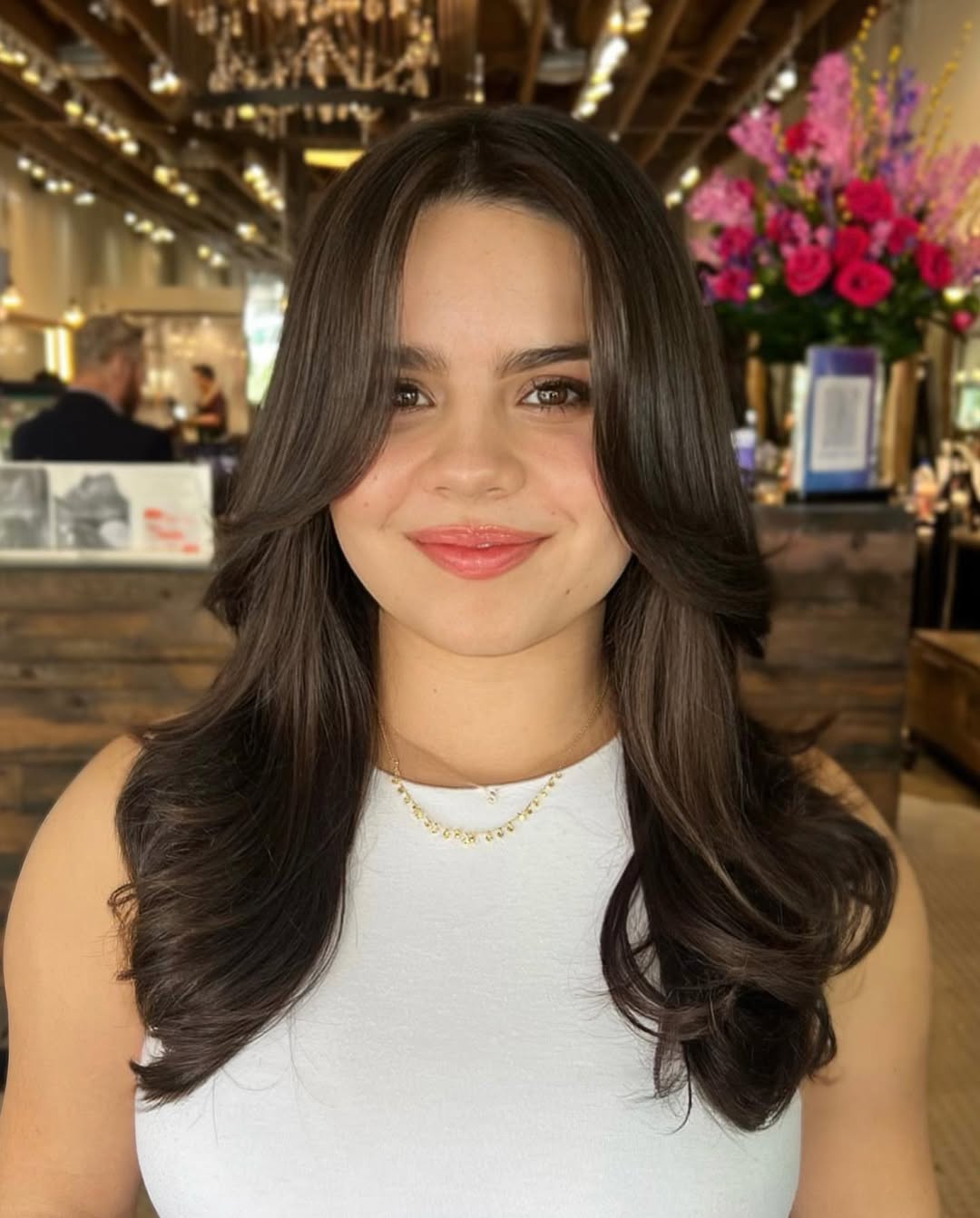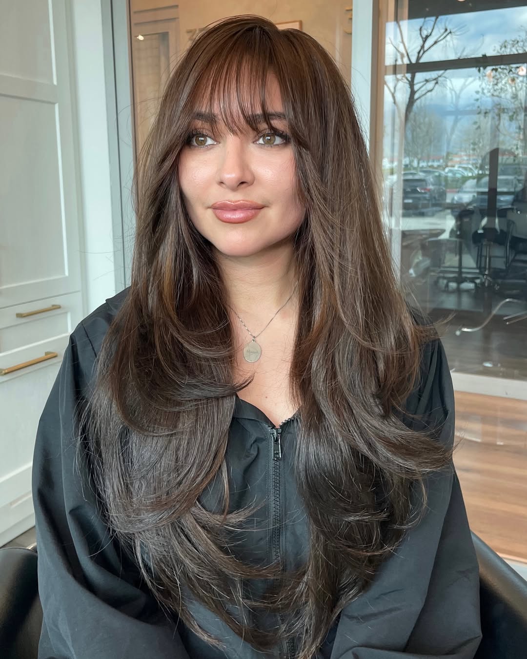 The soft and flowing style is done using long feathered layers that have wispy bangs, which are perfect in balancing a square-shaped face. The feathers remove the weight and bring elegance to the move, and the bangs gently cover the forehead and smooth the lines of the face. The hairstyle is ideal for a woman who is fond of versatile long hair and would desire something fancy and yet natural. The layers are popped with the light waves or curls, and some small highlights are added to give the layer a sense of dimension. The fashion brings the eyes up, hinting at a slim and lifted look, but with volume. It is easy, romantic, and good on all occasions- daily or an official occasion.