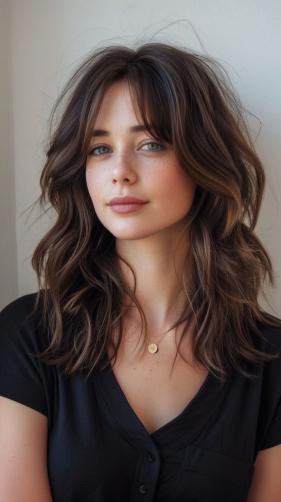 The combination of wispy bangs and shoulder-length hair with split ends is perfect, etc., as it adds movement to the hair and shifts attention in a way that there is no particular jawline. The layers are soft and provide volume, and redefine the shape of the face to a more oval shape. This haircut suits all hair types, including straight, wavy, and slightly curly, and provides simple ways of styling. The bangs are airy and outline the eyes and smooth the forehead, giving the face a longer and slimmer look. It can be utilised with beach waves or loose curls to add more body, or you can keep it straight to dress it up. It is the ideal daily wear that has a chic, young appearance.