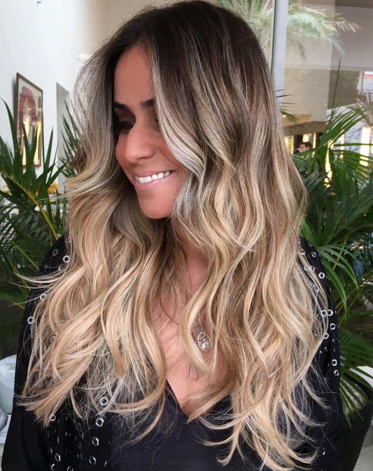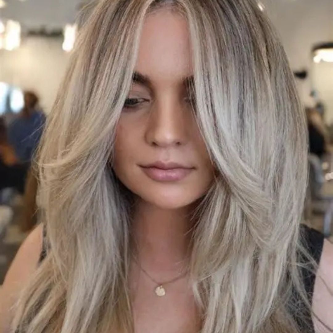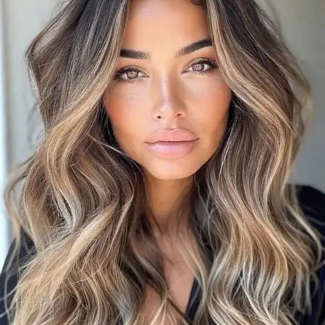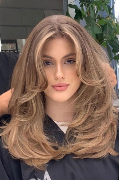 Long hair is shown with depth and visual appeal with highlighted layered waves. The layers are highlighted in the foreground, which accentuates the waves, rendering them clear and lively. This hairstyle is used to suit a long oval face, providing contrast and gentleness to the face. It does not matter whether you prefer caramel, blonde, or soft balayage highlights; the outcome is a glamorous and fashionable appearance. This hairstyle is stylish and attractive in every season.