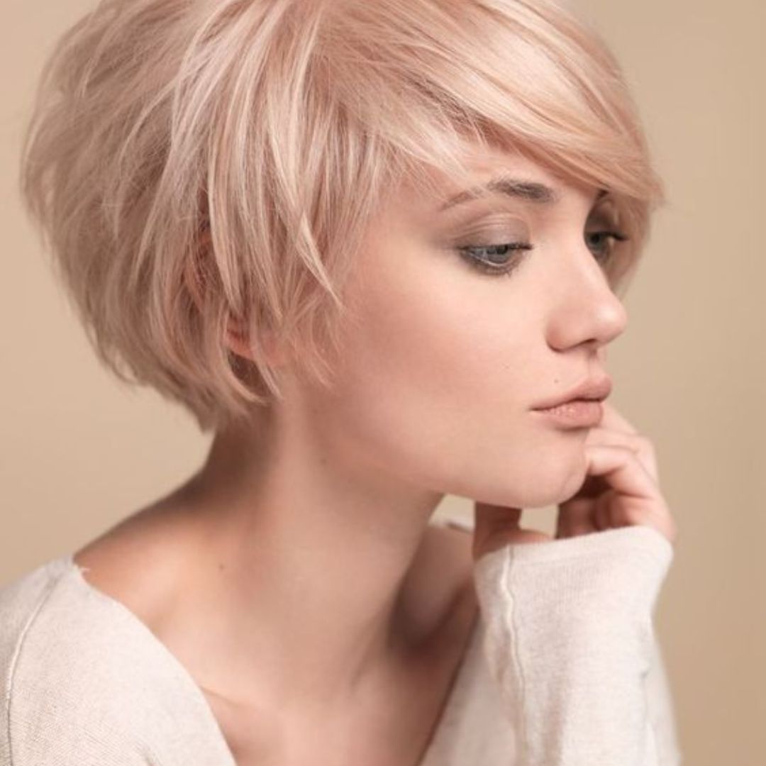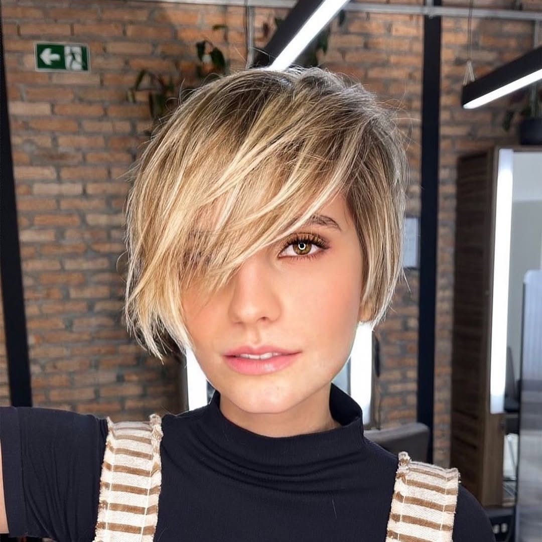 A pixie cut layered with side-swept bangs is dramatic, fierce, and on trend. The side bangs are softening the face by balancing the shortness and sharp lines of the pixie cut. The style suits straight or slightly wavy hair and is youthful and modern. It also brings out the eyes, the cheekbones, and the awline in a naturalized, fashionably chic appearance. Oval faces are well fitted with layered pixies with side bangs, as they are symmetrical yet flexible in terms of their styling. It suits the women who like a daring and low-maintenance hairstyle.